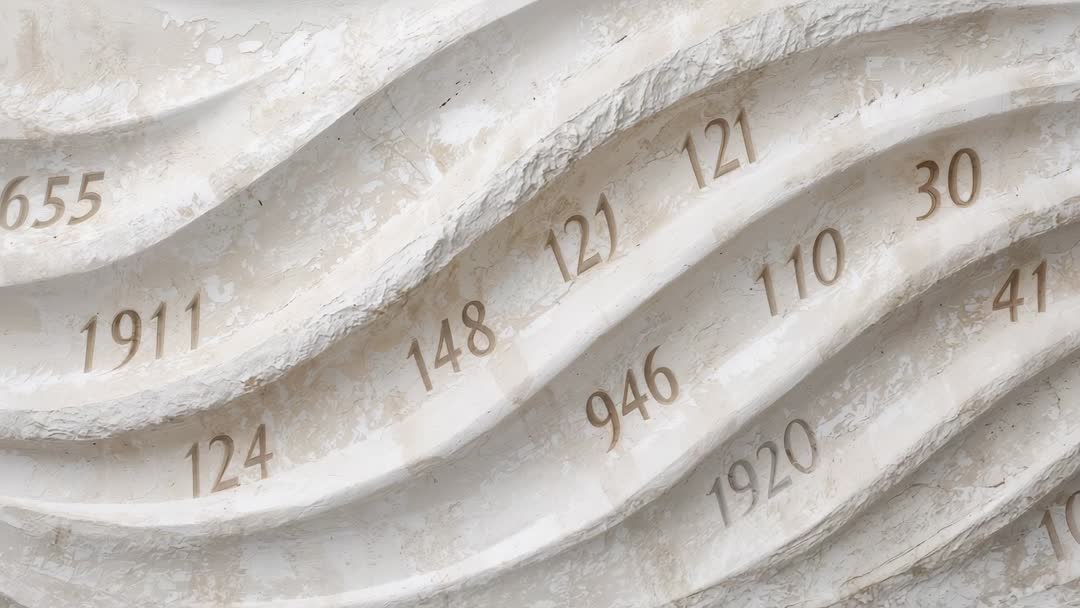AI Generated Image. Showing close-up of carved wave relief with etched numbers on weathered plaster, highlighting patina and grooved texture. Camera performing slow lateral pan with shallow depth of field, capturing tactile surface and engraved numerals. Serving in architectural documentaries, museum exhibition videos, conservation presentations, and design background loops. Working well for title sequences, lower third backgrounds, historical timeline visuals, and educational segments about sculptural techniques and material aging. Color grading to warm neutral tones or high-contrast monochrome to emphasize depth and shadow. Offering easy cropping for vertical social formats and looping for ambient backgrounds. Pairing with subtle ambient audio or narration for museum promos and restoration case studies.