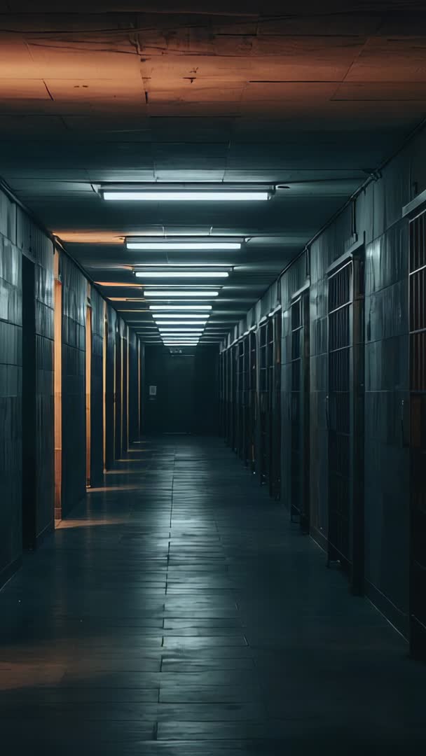 AI Generated Image. Vertical footage showing long, empty prison corridor under cold fluorescent lights, rows of barred cells lining both sides and strong leading lines drawing eye toward corridor end. Camera remaining fixed on corridor, producing steady, immersive perspective ideal for building suspense and tension. Lighting featuring cool overhead fluorescents with occasional warm spill through open cell doors, creating cinematic contrast and depth. Footage suiting crime drama openers, true-crime documentary sequences, editorial reports on prison conditions, social campaign content about criminal justice reform, thriller trailers, game environment concepts, or atmospheric B-roll for podcasts and presentations. Vertical aspect ratio fitting mobile-first platforms, social reels, and short-form storytelling. Clip providing easy color grading and loop-friendly composition for seamless editing and integration into longer sequences.
