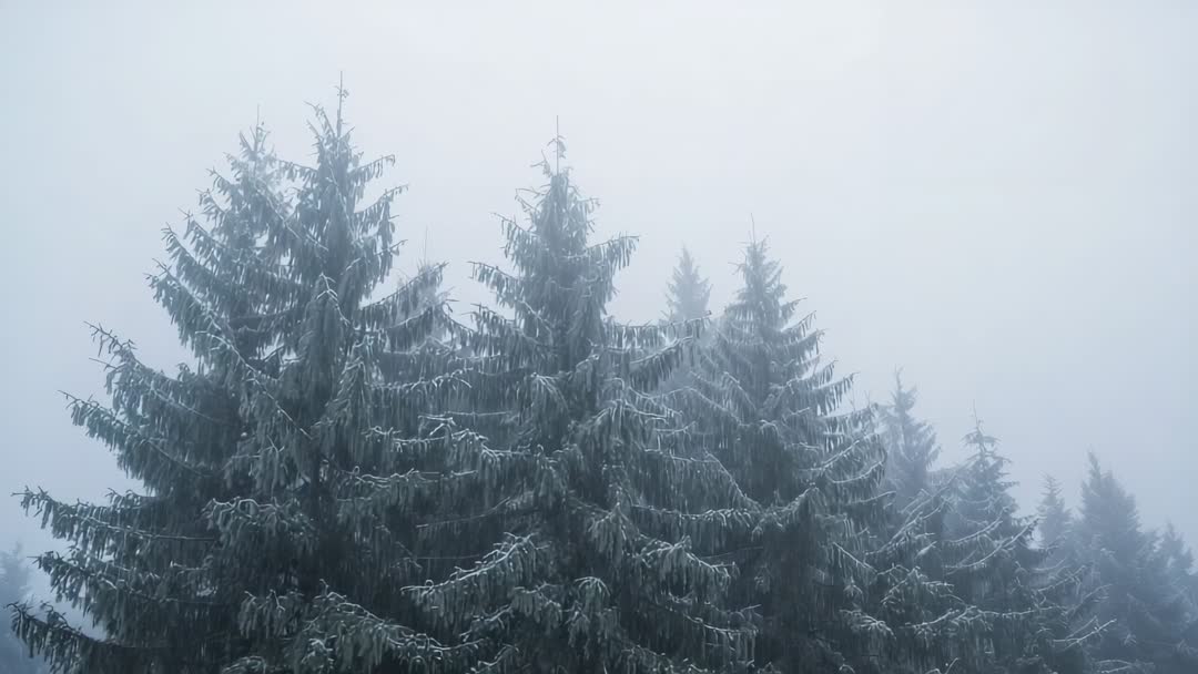 AI Generated Video. Video capturing frosted conifer crowns from low angle, fog wrapping branches, soft blue light filtering through. Camera holding steady on slow tilt-up revealing layered treetop silhouettes fading into mist. Cool blue palette and gentle motion creating calm, moody atmosphere. Suited for nature documentaries, seasonal commercials, winter travel promotions, meditation and wellness apps, environmental campaigns, and title backgrounds for film and TV. Useful for website hero sections, social media headers, desktop wallpapers, and ambient background loops. Clip providing generous negative space in upper frame for text or logo overlay and integrating easily into montages or cross-dissolve transitions.