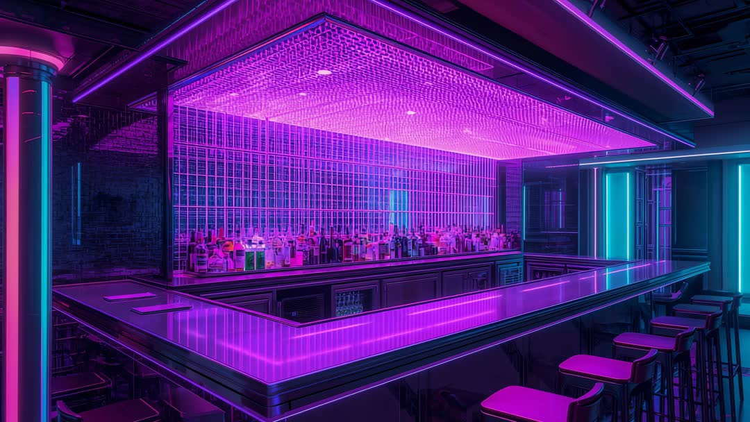 - Filming Neon L-Shaped Cocktail Bar With Magenta Glow, Bottles, Stools, Retro Nightclub Vibe
