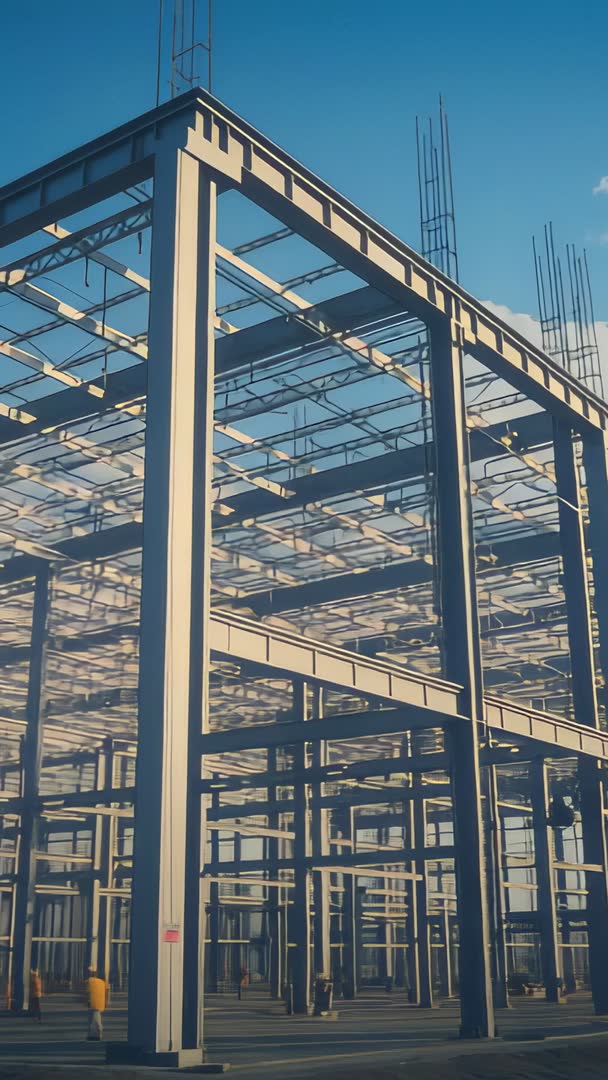 AI Generated Image. Vertical video showing steel-frame structure rising with grid of columns and beams, workers wearing high-visibility vests inspecting rebar under clear daylight. Camera framing emphasizing vertical lines and layered geometry, creating strong sense of scale and modern industrial aesthetic. Shadows and sunlight creating contrast and depth, suitable for dramatic opening shots and technical demonstrations. Use for construction company branding, architecture and engineering presentations, investor updates, safety training, social media reels, or mobile ads. Recommend adding lower-third text and logo, using subtle color grade to enrich steel tones, and including voiceover or ambient construction sound for full motion use. Clip working well as background for timelapse sequences, before-and-after comparisons, and editorial coverage of urban development. Frame orientation optimized for mobile vertical platforms and short-form video content.