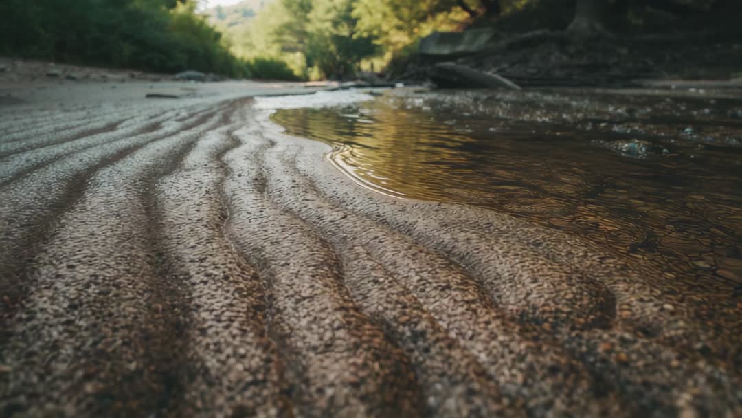 AI Generated Image. Video capturing low-angle close-up of rippled wet sand along shallow creek, revealing delicate sand ridges, pebbles, and gentle water movement. Camera panning slowly while sunlight reflects on water surface, producing warm golden highlights and glossy textures. Footage serving for background loops in website hero, social media headers, meditation apps, nature documentaries, and environmental campaigns. Suggested uses including slow loop with subtle crossfade, ambient water sound or soft ambient music, and color grading to boost warm tones and emphasize sand texture. Useful for B-roll in travel and outdoor storytelling, educational content about erosion and stream ecology, wellness marketing, and calming visual meditations.