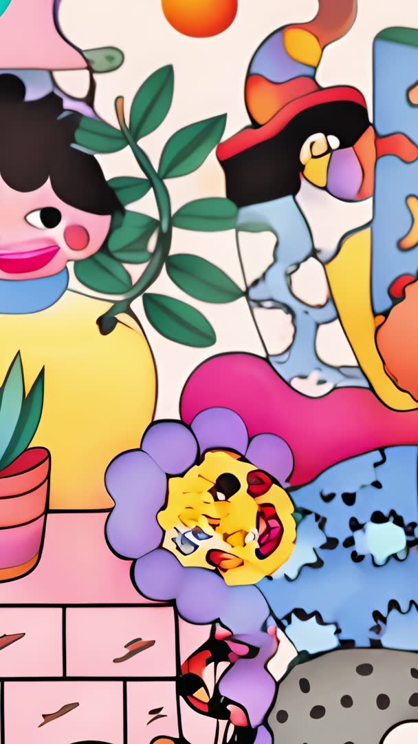 AI Generated Video. Showing vibrant abstract mural with stylized figures, bold colors and potted plant against brick backdrop. Filming vertical video frame focusing on close-up of playful shapes, floral motif and textured brick pattern. Suggesting use in social media reels, website hero banners, modern art blog features, music video interludes and promotional ads for design studios. Serving as visual asset for gallery documentation, mural tours, interior design moodboards and educational segments on contemporary street art. Providing loopable footage potential, easy crop for horizontal or square formats and color palette inspiration for branding or packaging. Licensing options covering commercial and editorial use.