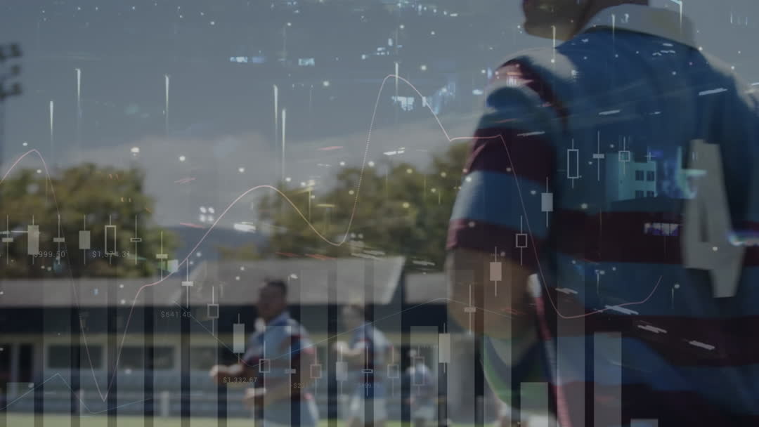 Image portrays financial data and graphs digitally overlaying a scene with players on a rugby field. Represents intersection of sports and technology, illustrating real-time analytics, finance in athletic industries, and digital transformation in global sports. Ideal for use in content related to sports economics, technology in sports, and fintech solutions in sports sectors.