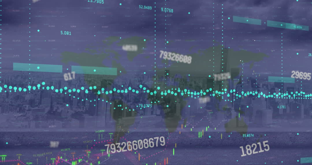 Dynamic animation featuring financial data numbers overlaying a world map above a cityscape, representing global business activities and technological advancements in finance. Ideal for illustrating concepts of global markets, finance technology, stock market trends, and economic data visualization for websites, presentations, and business-related media content.