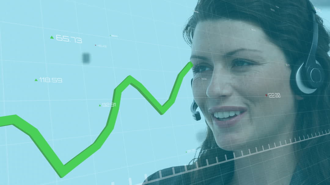 Image depicts a female consultant wearing a headset overlayed with rising financial graphs. The setup evokes concepts of customer service in the finance sector, data analysis, and economic advisory services. Useful for conveying messages on financial growth, economic projections, business communications, or enhancing a corporate brochure discussing market strategies.