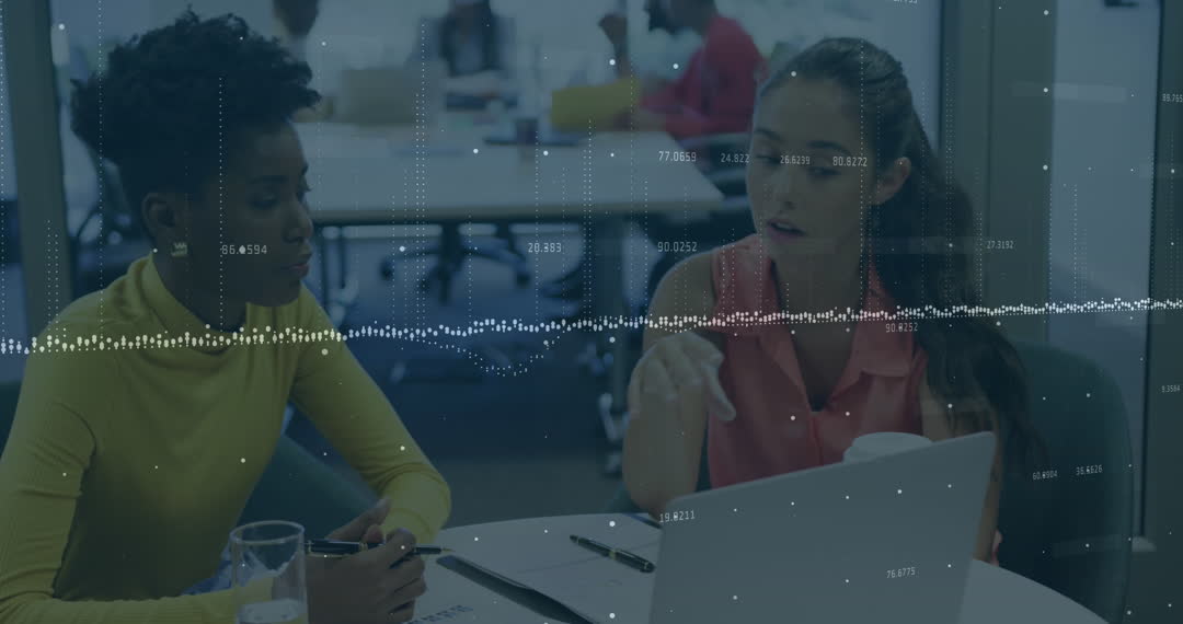 Two professionals analyzing financial data in a modern corporate office. The video shows a digital overlay of financial statistics, symbolizing analysis and technology integration in business discussions. This visual can be used to represent global business concepts, corporate communications, or advertisements showcasing dynamic workplace environments.