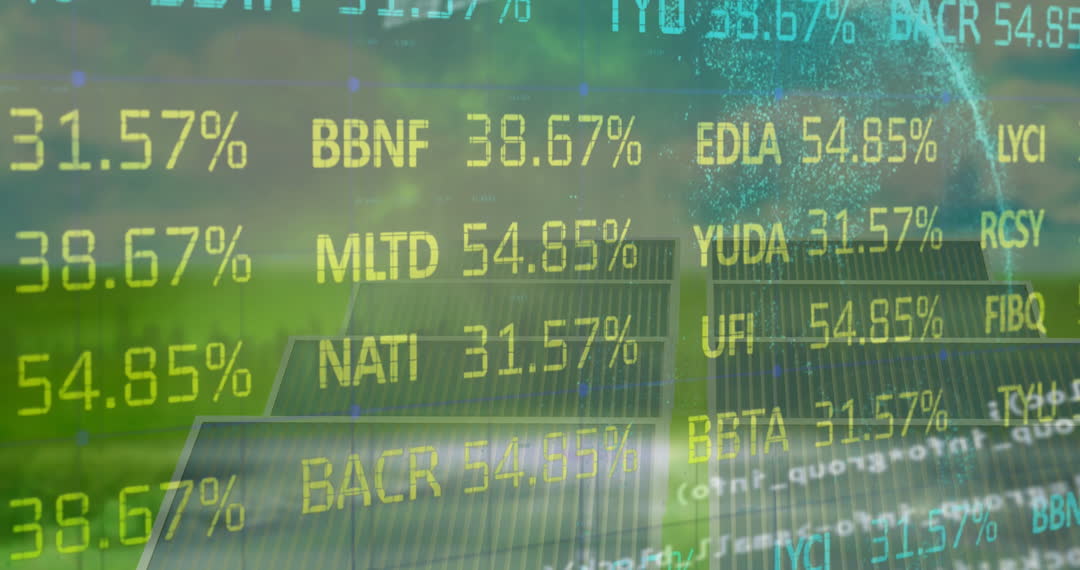 This visual blends financial data with videos of solar panels, emphasizing the intersection of green technology and financial investment. Ideal for illustrating concepts in clean energy financing, sustainability economics, tech investments in renewables, and environmental impact reports.