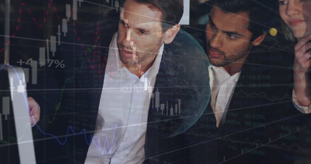 Professionals are deeply focused on a computer screen with financial graphs and a globe video superimposed. This video, illustrating a global financial concept, is useful for themes related to international business, market analysis, and teamwork, making it ideal for business presentations, websites, and articles on global finance trends.