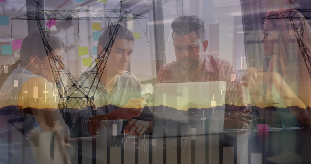 A group of diverse business professionals working together, looking at a laptop screen with visually complex financial data represented by transparent charts overlapping the scene. The addition of a high voltage tower suggests industry insights or energy sector considerations. Useful for illustrating concepts of collaborative financial analysis, technology in business settings, energy market analysis, or cross-disciplinary teamwork.