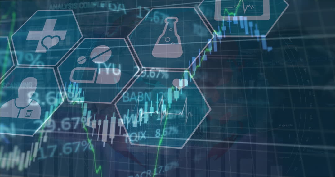 Abstract depiction of financial analysis chart interspersed with healthcare icons. Represents the intersection of financial growth and medical research facilitated by technology. Suitable for use in presentations on health tech innovation, articles about the role of digital solutions in healthcare progress, or as a thematic backdrop in business or medical technology contexts.