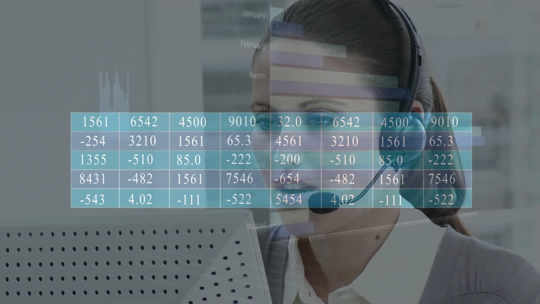 Businesswoman using phone headset while analyzing financial data represents modern, dynamic work within finance and technology sectors. Useful for illustrating concepts of remote work, financial consulting, or digital communication in business presentations or advertising material.