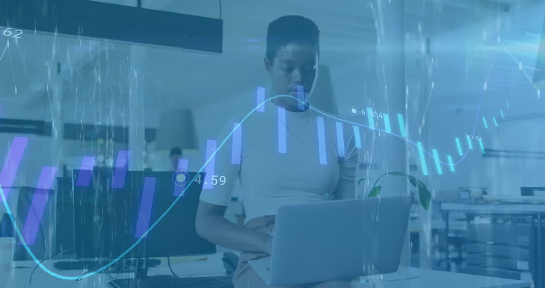 A diverse business professional is working on a laptop in an office with a superimposed digital financial data display. Designed for themes of globalization, modern business solutions, technology interaction, and financial analysis. Ideal for websites or articles focusing on business trends, financial technology, or dynamic work environments.