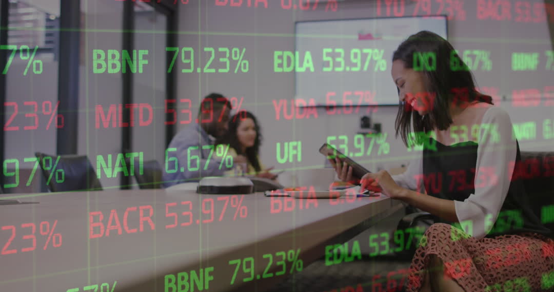 Visualizes a financial analyst in a contemporary office setting with stock data overlays, representing modern finance professions. Suitable for illustrating business communication, financial markets, data-driven decision-making, office teamwork, and corporate finance themes. Useful for articles, blogs, and advertisements in financial sectors.