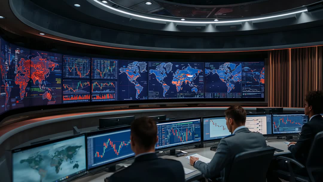 - Financial Analysts Monitoring Global Markets in High-Tech Control Center