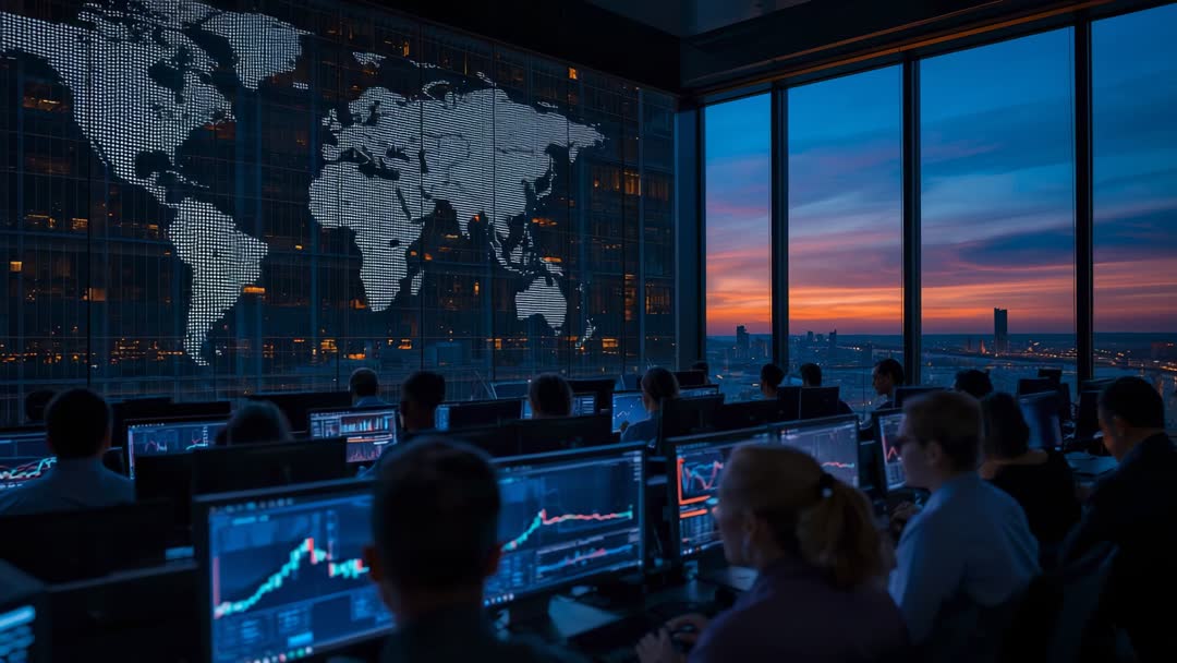 AI Generated Image. Video captures team of financial analysts working diligently at night in a modern trading center. Large LED world map illuminates room, showcasing global presence and interconnectedness of trading data. Analysts adjust headsets, type updates on several monitors, interpreting stock trends as sundown provides ambient lighting through floor-to-ceiling windows, reflecting corporate atmosphere. This video illustrates industry professionals immersed in high-stakes finance work, ideal for articles about technology's role in financial markets, presentations about global business and investment strategies, or editorial pieces exploring stock market dynamics.