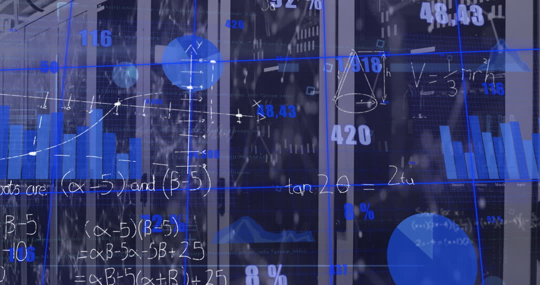 Visual represents advanced data processing in a server room with digital interfaces, ideal for illustrating concepts of global business and financial technology. Contains equations and graphs symbolizing complex algorithms and analytics, making it suitable for topics related to stock market trends or futuristic technology solutions.