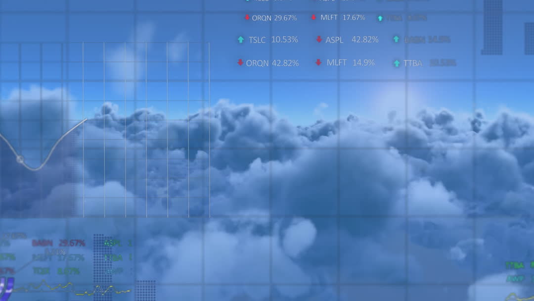 Digital interface of financial data analytics superimposed on cloud videory symbolizes modern technology and global finance trends. Best used in finance and tech presentations or publications targeting investment insights or market analysis technologies.