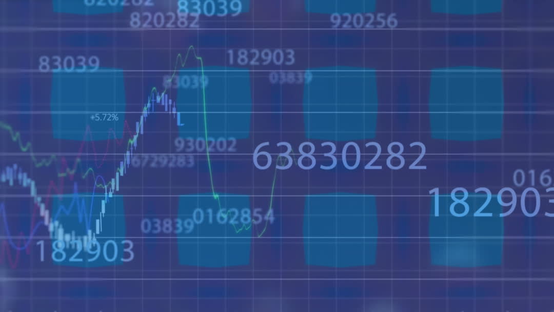 Abstract animation combining financial graphs and virus cells creates a metaphor for examining economic impacts during a pandemic. This can be used in presentations or materials related to finance, economics, healthcare, and disease outbreak management.