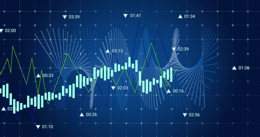 The video portrays a digital financial chart with candlestick and trend lines in shades of blue and green, demonstrating upward and downward movements, suggesting economic market trends. This abstract design can be used in finance-related presentations, educational materials, or as a visual aid for investors assessing market movements. It effectively illustrates key concepts in technical analysis and data visualization.