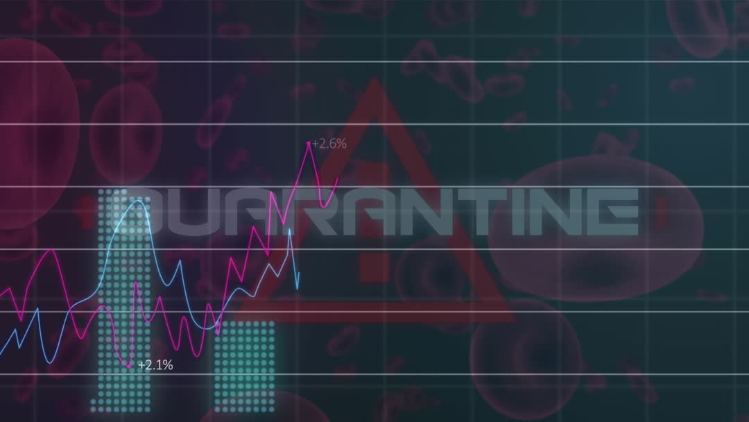 Abstract illustration featuring financial data and quarantine warning over an video of blood cells. Useful for conveying concepts related to the economic and financial impacts of global health crises. Ideal for articles on pandemic effects, financial adaptations, and health statistics.