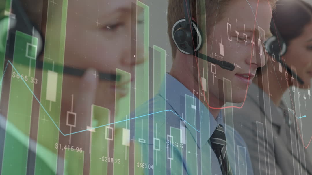 This video displays a team of financial consultants wearing headsets and actively engaging with virtual charts that signal stock market analysis. Ideal for presentations and articles focused on finance, global business, and cutting-edge technology. Useful for depicting a modern, tech-savvy business environment or marketing materials for corporate financial services.