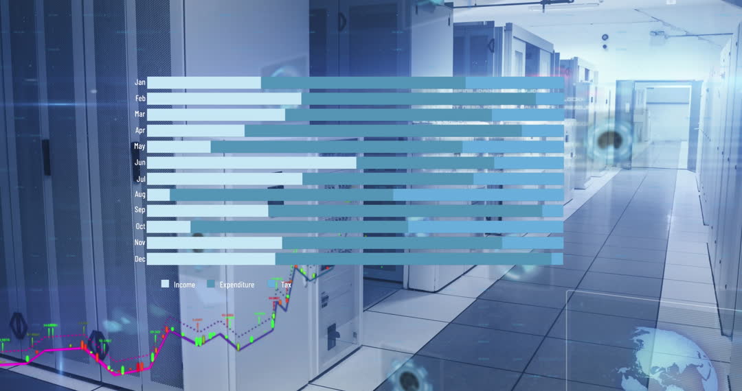 Visual blend of financial data and server technology. Shows analysis trends with financial graphs and charts. Modern and futuristic technology settings highlight business and information processing. Great for illustrating concepts in global finance, emerging technologies, and business intelligence strategies.