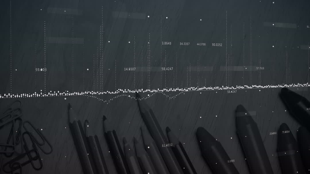 This multimedia video features financial data graphs superimposed over a collection of pencils and crayons. It symbolizes the intersection of creative thinking and data analysis, highlighting how artistic strategies can integrate with financial techniques. Ideal for illustrating concepts related to business innovation, educational presentations on economics, and the integration of creative entrepreneurship with data-focused methodologies.