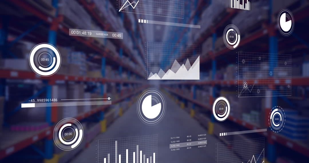 Data analytics overlaying a warehouse conveys theme of digital transformation in logistics and supply chains. Perfect for illustrating concepts of global business efficiency, shipping innovations, and the technological shift in inventory management systems. Useful for technical articles, presentations on logistics digitization, and educational materials on finance and data integration.