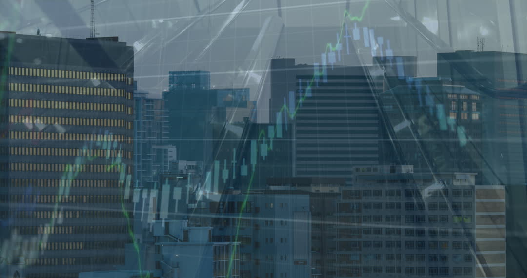 This visual presents a blend of modern urban landscape with dynamic financial data charts overlaying it. It encapsulates concepts of global finance and technological advancement. Use it for presentations, financial reports, corporate content, or educational purposes on financial markets and economy.