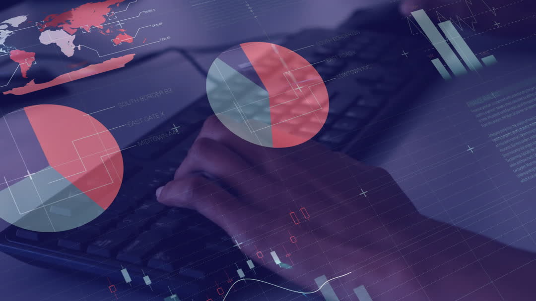Representation of financial data overlaying hands typing on computer keyboard. Charts and graphs highlighted, indicating financial analysis in corporate environment. Useful for illustrating finance technology, stock market analysis, business strategies, or data-driven decision making.