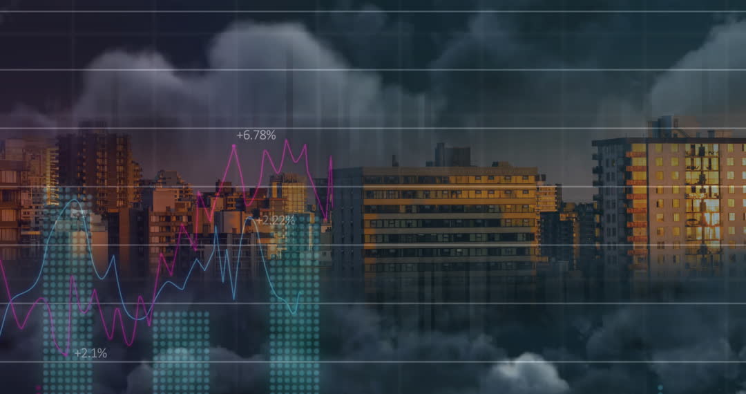This visual represents the intersection of financial data processing with an urban environment. The cityscape overlaid with analytical graphs suggests global economic activity and urban business growth, making it ideal for use in presentations about city economics, digital finance initiatives, or any business-focused content on economic analytics.