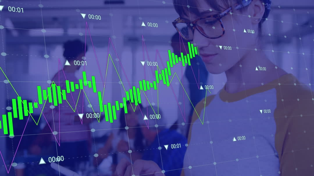Professional setting shows individuals working collaboratively with financial data analytics overlay. Ideal for illustrating modern business environments, technology integration, and professional teamwork in finance or entrepreneurship materials.
