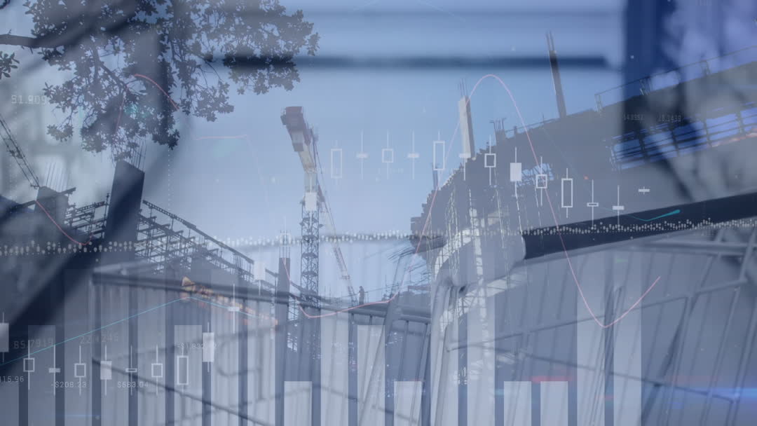 Intriguing overlap of financial data charts with urban development, highlighting global business growth. Suitable for presentations on urbanization, market trends, finance or as a conceptual piece illustrating modern economic strategies. Captures the merging of technology and city expansion representing future global trends.