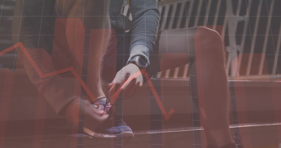Visual showcasing financial data graphs overlaid on a man tying sports shoes, symbolizing the intersection of finance and fitness. Perfect for illustrating topics related to economic movement, financial planning, business strategy in sports market, or tech integration in healthcare.