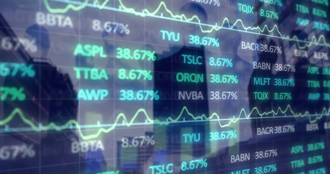 Visual depicts stock market data and silhouettes of business individuals with tall buildings in the background, representing connections between global finance and urban business environments. Useful for illustrating concepts of trading, investment strategies, economic growth, and technology in the financial sector.