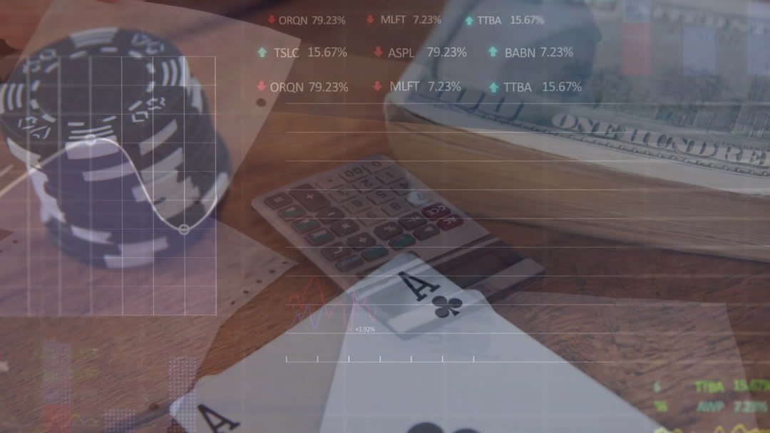 Combination of financial data animations with classic casino elements like playing cards and chips over documents and a calculator, offering a unique visual for themes like gambling and economics. Ideal for articles on financial risks, investment strategies involving chance, budgeting contrasts, or the intersections between economy and gaming industries.
