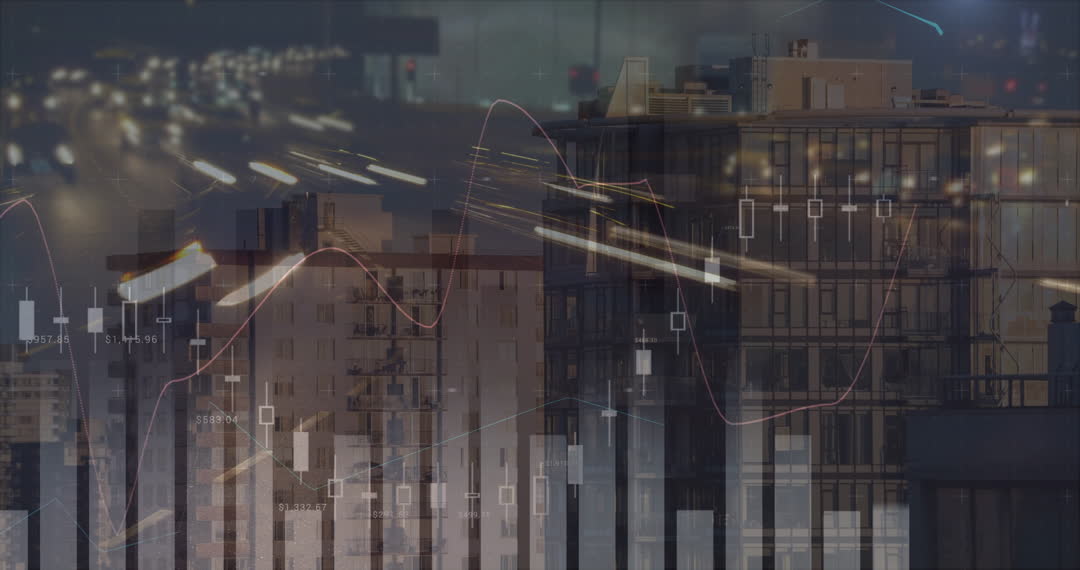 Visual representation of financial data blending with a cityscape, embodying the concept of global market trends and finance technology. Perfect for illustrating topics in finance, urbanization, digital innovations, stock markets, or economic analysis. Can be used in presentations, articles, or digital design projects focusing on investment strategies or technological advancements in finance.