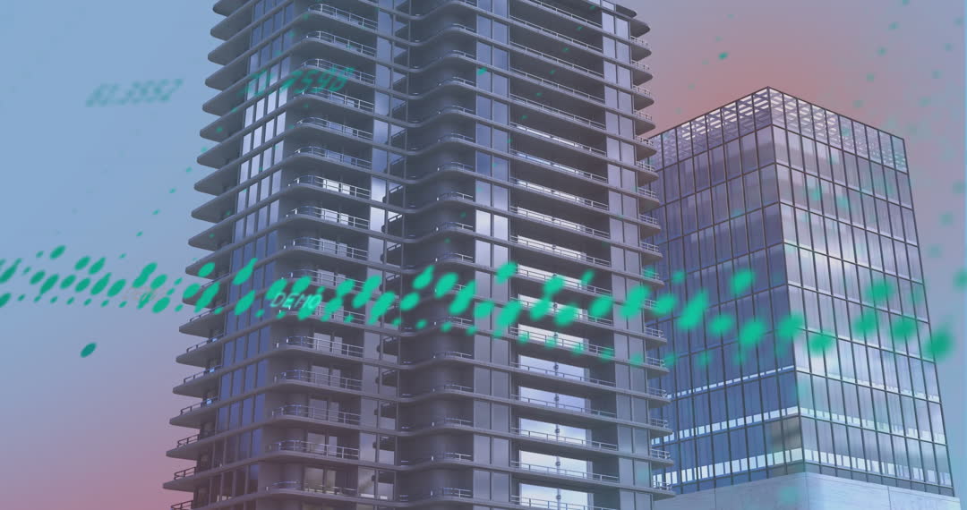 Skyscrapers prominently display digital animations of financial data and graphs, symbolizing global economic trends and analytical insights. Ideal for illustrating themes of business analytics, investment forecasts, and corporate economic discussions.