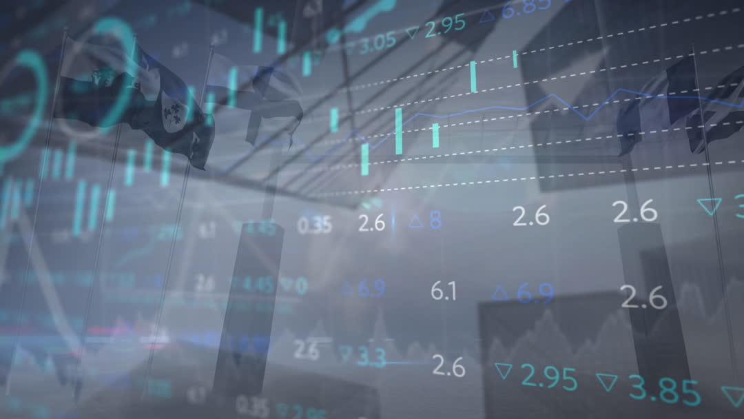 Abstract video featuring financial data and graphs overlaid with digital elements including flags and arrows, highlighting concepts like global economy, green energy, and macroeconomic trends. Suitable for use in finance, investment communications, educational materials, and presentations related to global market analysis and economic studies.