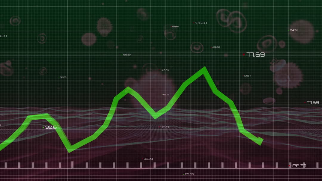 Vibrant digital animation illustrating financial statistics over a grid backdrop. This futuristic graphic is ideal for presentations and promotional content in finance, economics, and technology sectors. It showcases fluctuations in market data, which can be related to reports or educational resources regarding trends in business and economy. Enhance financial blogs and media presentations with this visually engaging depiction of data analytics.