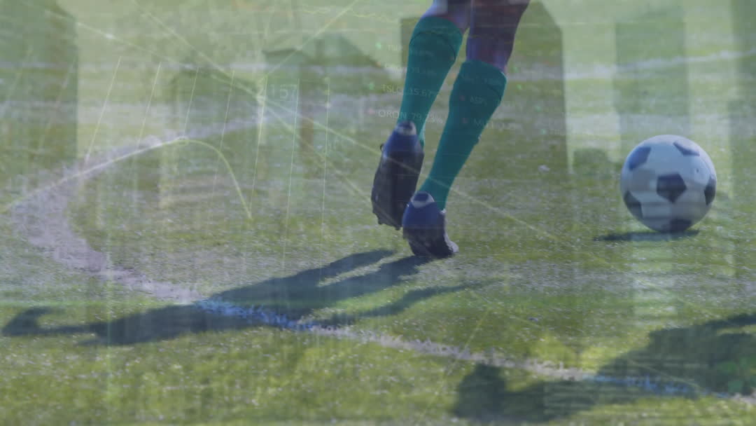 Creative juxtaposition showcasing financial data overlaying soccer training legs, reflecting the integration of sports and finance. Useful for illustrating innovative economic theories in sports management articles, advertizing multi-sector collaboration, or financial strategy in sporting entities.