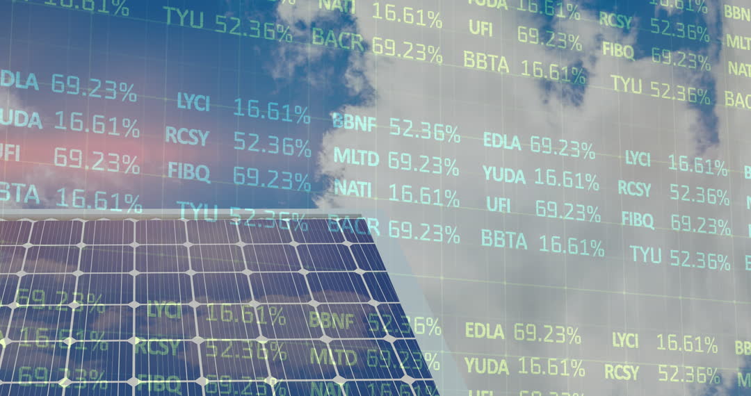 Financial Data and Solar Panel with Cityscape Reflection Video
