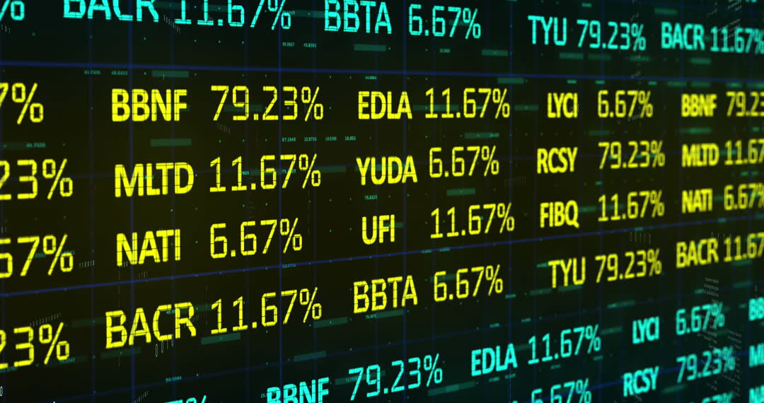 This illustration shows animated financial data with stock figures and ticker symbols. Displays percentages next to various financial indexes or stock codes, suggesting constant updating of stock pricing or market data change over time. Useful for projects involving finance presentations, economic research materials, financial business websites, or educational purposes in studying market trends.