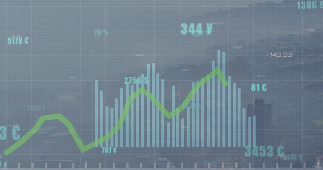 Animated graphic of financial data overlays a cityscape background, illustrating complex financial analyses and business insights. Useful for presentations on finance topics, business strategy sessions, or educational content focused on economic trends and market behavior.