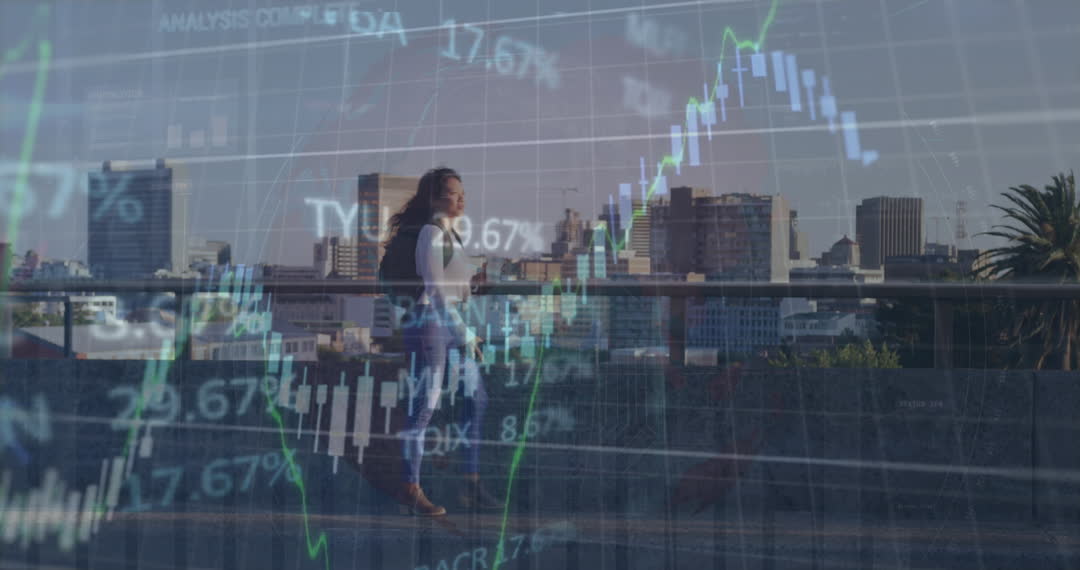 This video displays an animated overlay of financial graphs and stock data against a backdrop of a cityscape, featuring a woman walking. It illustrates themes of modern business, financial markets, and urban life, making it suitable for articles about global economics, digital finance solutions, or presentations on market analytics and architectural innovation.