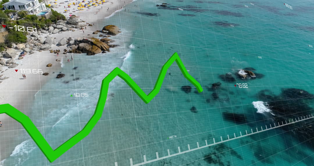 Animation features financial data overlaid on a tranquil coastal view, intersecting ocean and beach. Concept illustrates digital transformation in finance, combining serene nature with tech innovation. Perfect for use in articles or campaigns centered on finance, global markets, or digital storytelling that emphasizes merging technology with real-world environments.
