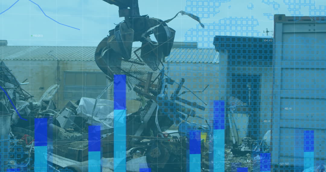 Financial graphs overlain on a recycling yard, blending technology and environmental themes. Useful for topics on sustainable development, economic analysis in recycling industries, or presentations on data-driven waste management solutions.