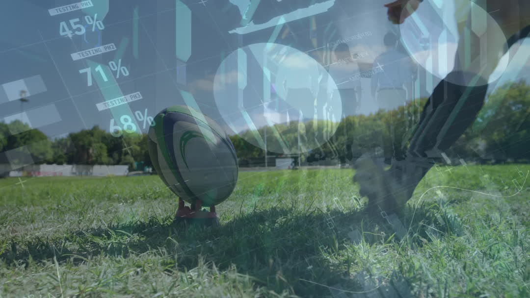 Animation overlaying financial data processing with rugby activity and business professionals, illustrating the dynamic intersection of sports and finance. Suitable for use in articles or presentations exploring synergies between these fields, digital marketing, or multimedia designs highlighting innovation and diverse environments.