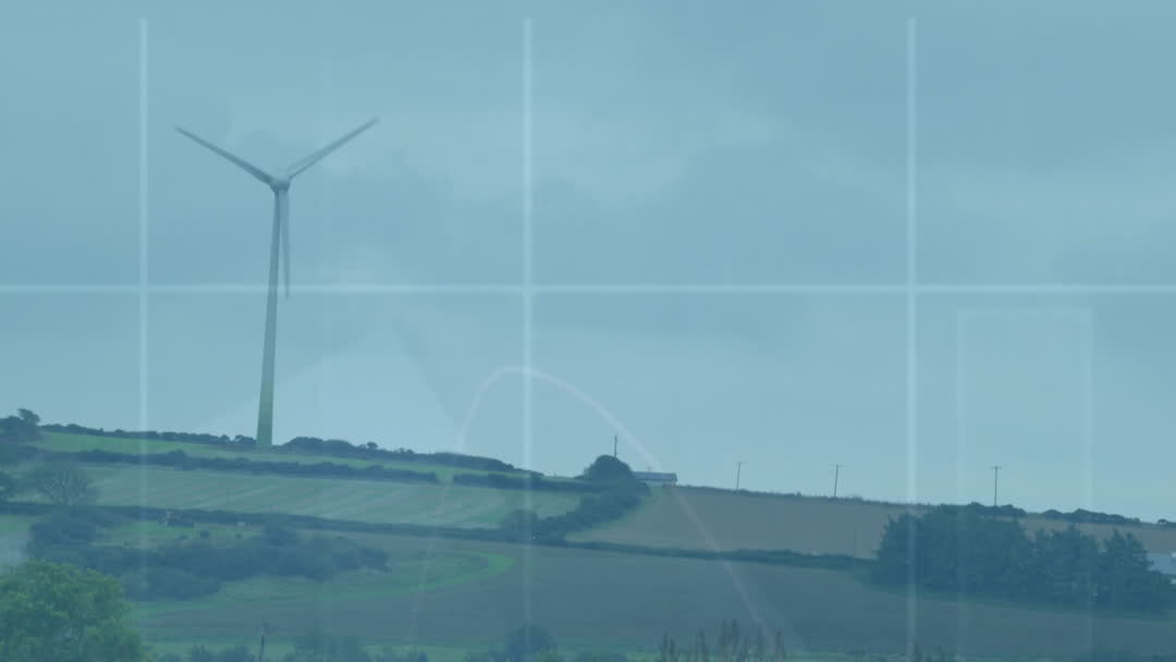 Animation featuring financial data gridding against a backdrop of a rural landscape with a wind turbine, showcasing the blend of technology and renewable energy. Represents themes of sustainability, global business, and data analytics. Suitable for use in presentations or marketing materials about renewable energy projects, business intelligence, and environmental technology.